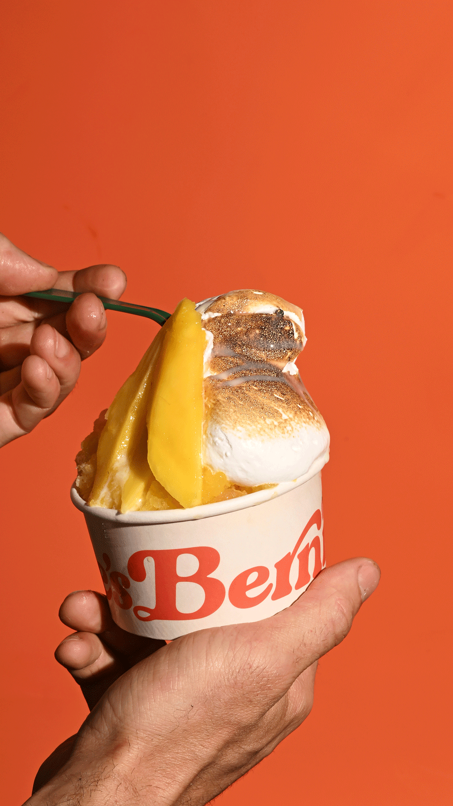 Bernie's, founded by private chef Jon Berne, celebrates beautifully crafted desserts through fresh ingredients and nostalgic summer flavors. The brand identity features a bold color palette and vintage typeface honoring Italian ice traditions. Playful design elements—including puffy text and custom ligatures—reference the signature toasted meringue topping. Editorial-style photography with vibrant backdrops completes the visual identity.